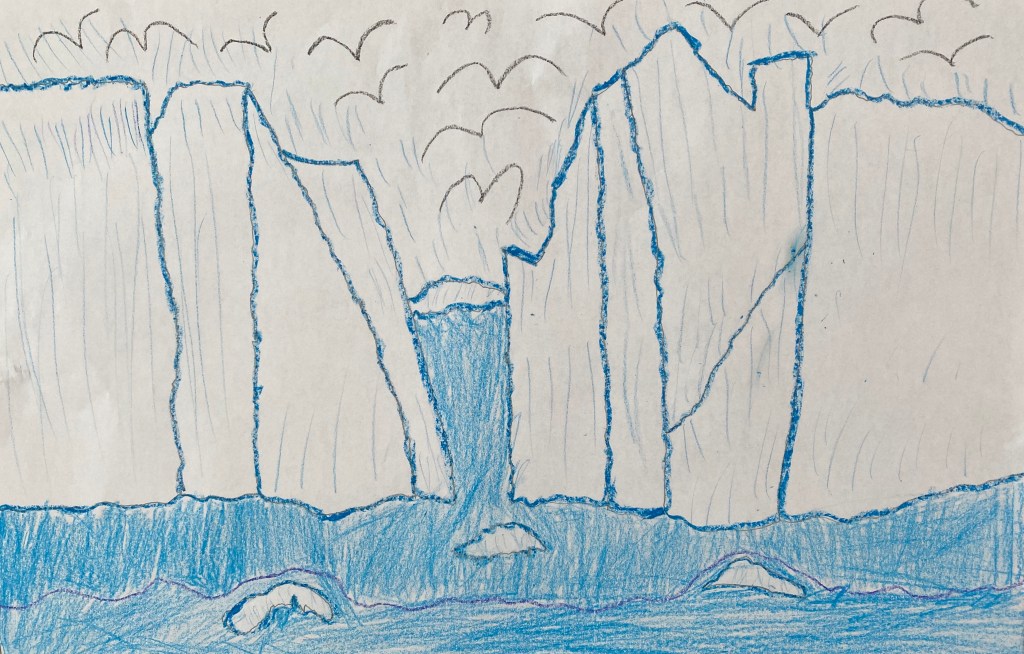 I drew it by using crayons and pencil. Glaciers are chunks of ice and they are in the Arctic and Antarctic oceans. They form by snow falling on top of some snow and then it turns into ice.