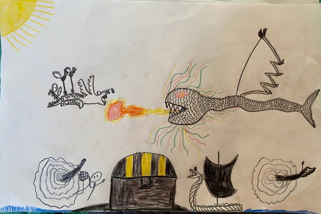 This is a dragon chasing a crazy bird with some treasure underneath. The squiggly things with the head and tail coming out are portals with a monster passing through them. I just made this up myself. I liked drawing the fireball and the dragon the best.