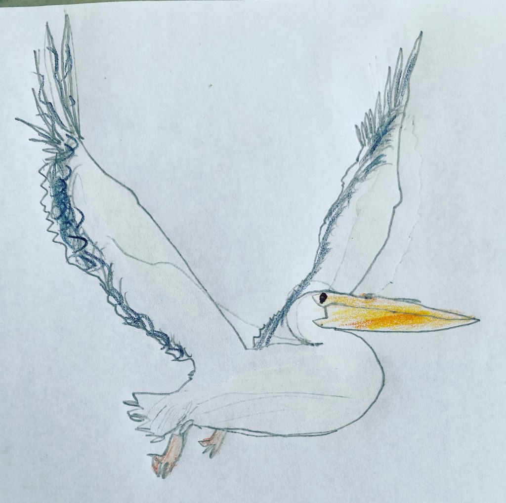This is a picture of a pelican I drew using color pencils. I looked at a picture of a pelican in a science book to draw it. The pelican is flying.